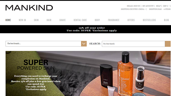 在眾多的英國(guó)美妝網(wǎng)站中,Mankind以它獨(dú)有的風(fēng)格而收到廣大群眾的注目,因?yàn)樗且粋€(gè)專做男士護(hù)膚品的網(wǎng)站。在護(hù)膚這一塊上似乎是女性居多,但是男士的臉同樣也需要保養(yǎng)。這個(gè)購(gòu)物網(wǎng)站有很多知名品牌如:碧倩、歐萊雅、伊索Aesop等護(hù)法護(hù)膚的牌子,而且滿30磅就能免郵,實(shí)時(shí)跟蹤物流,收貨時(shí)長(zhǎng)控制在一周左右。
