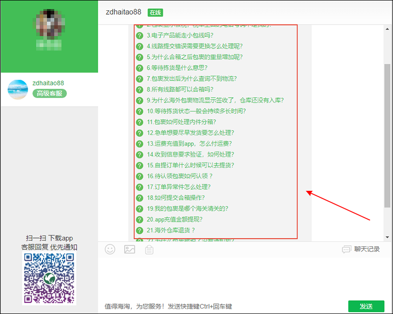 3. 優(yōu)質(zhì)客服:一個(gè)專業(yè)、耐心的客服也是尤其重要的,海淘族如何選擇轉(zhuǎn)運(yùn)公司?首先從客服的專業(yè)程度大可看得出來,畢竟不是一知半解的都能去承接轉(zhuǎn)運(yùn)任務(wù),不是嗎?這家轉(zhuǎn)運(yùn)公司有著豐富的海淘轉(zhuǎn)運(yùn)經(jīng)驗(yàn),團(tuán)隊(duì)強(qiáng)大。而且它們也整理了些各大網(wǎng)民常問的海淘轉(zhuǎn)運(yùn)問題如:“包裹如何進(jìn)行智能分箱?”、“電子產(chǎn)品能夠走小包線嗎?”、“包裹是哪個(gè)海關(guān)清關(guān)的?”方便大家快速找到答案,如果你還有其他的疑問,客服也會(huì)耐心地講解。